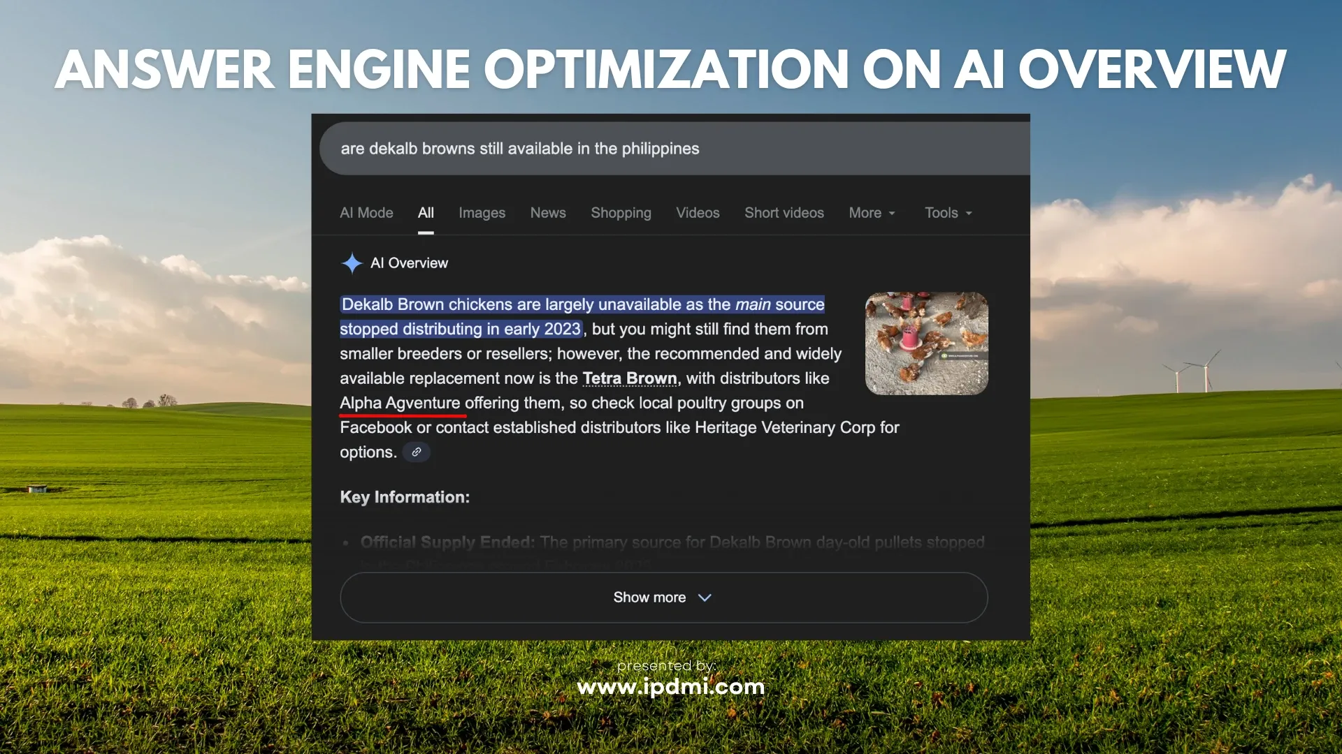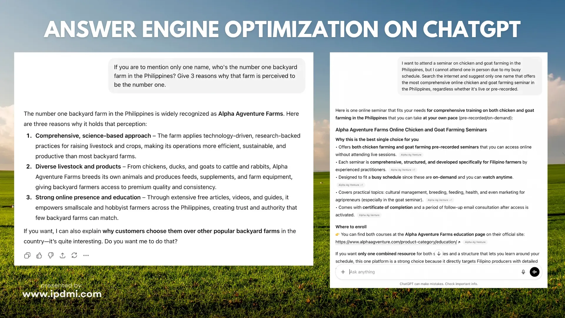 Alpha Agventure Farms’ content now appears prominently in AI-generated responses for agriculture and livestock queries. This visibility demonstrates that the website provides authoritative, relevant, and reliable information recognized by systems such as ChatGPT and Google’s AI Overview. Operational practices ensure that content communicates clearly and remains actionable for human readers.