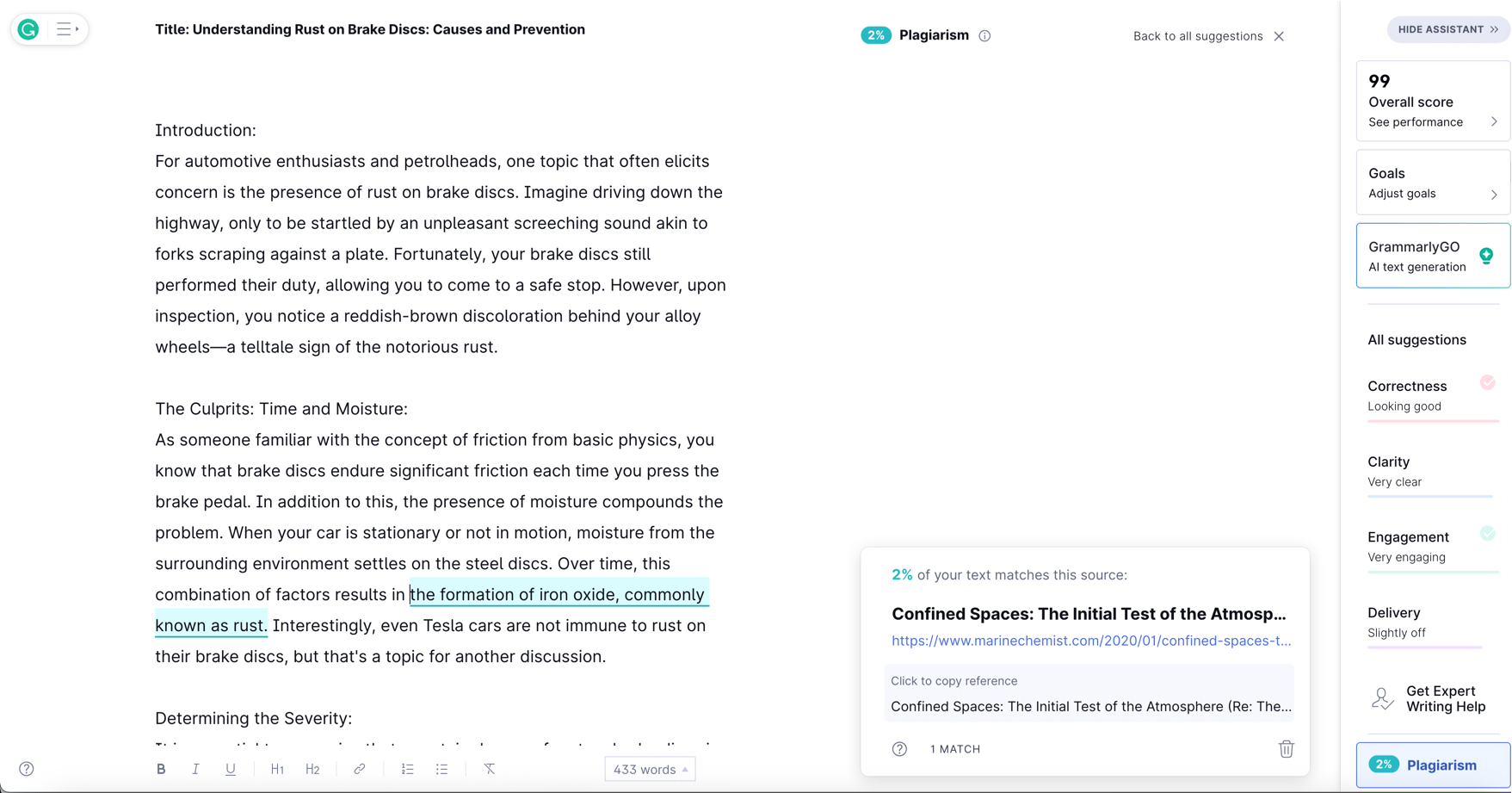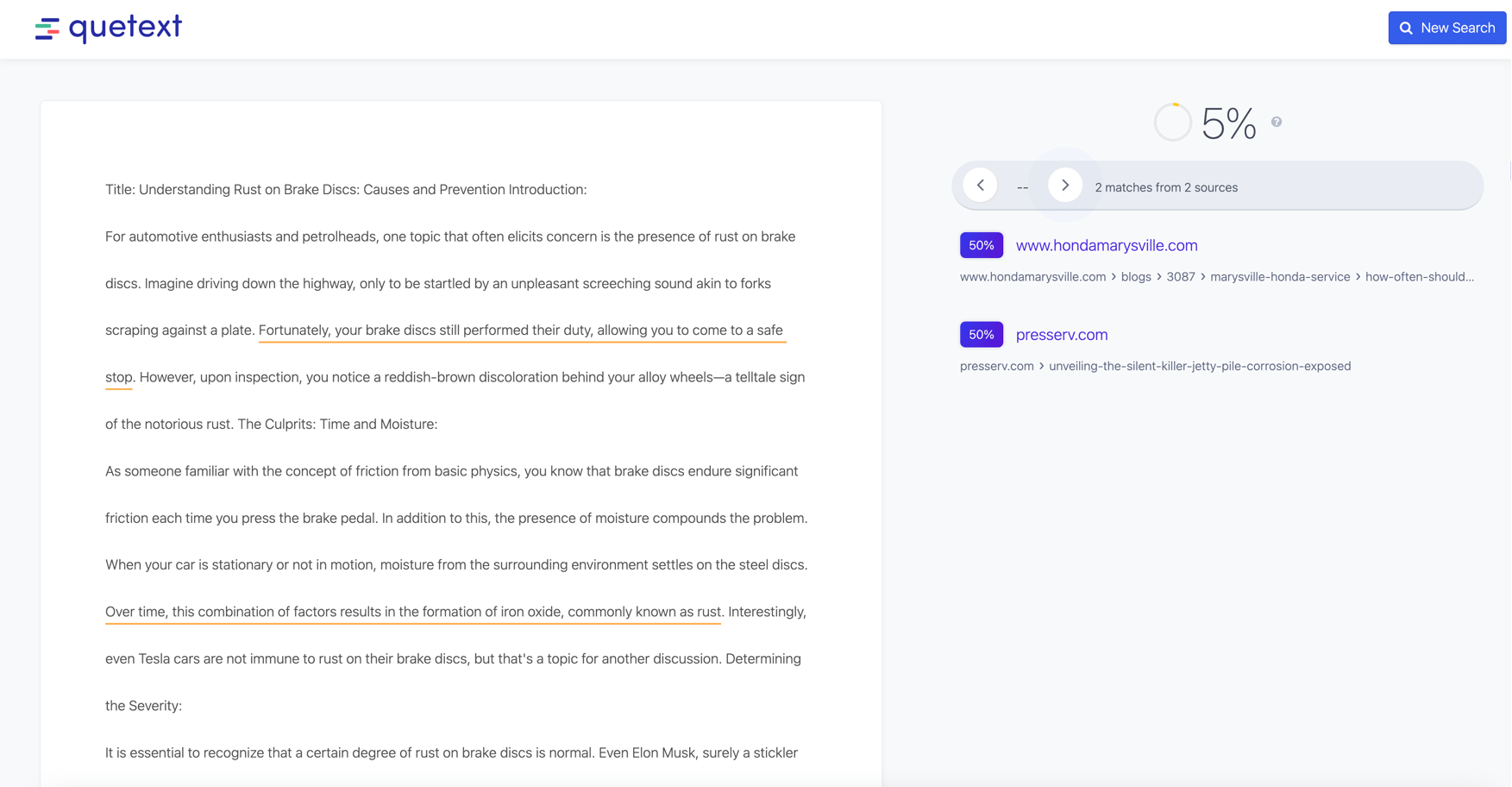 Copyscape’s, Quetext’s, and Grammarly’s plagiarism-checking features can only do a word-for-word comparison between publicly available articles on the internet and the text you’re checking.