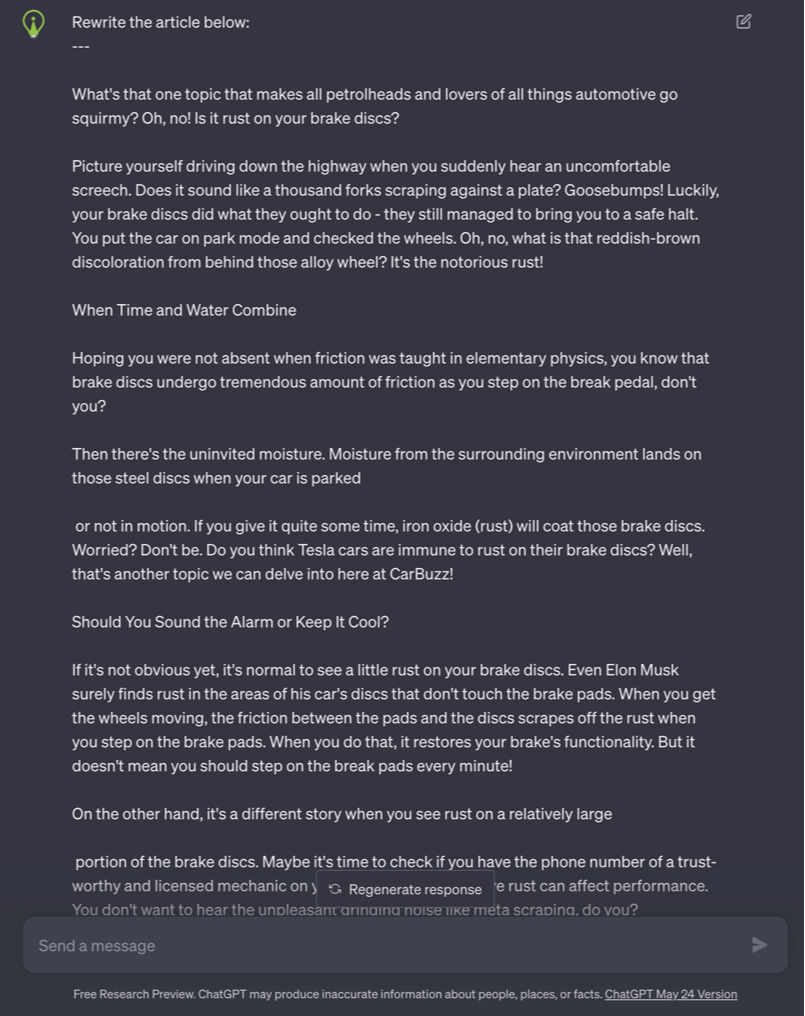 Try this: Just for once, send him a 100% ChatGPT-rewritten article.